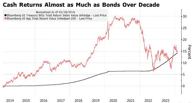 自2021年以来,美国债券市场的损失非常严重,几乎抹去了过去10年相较于现金市场的任何额外收益。包括美国国债和投资级公司债在内的彭博美国综合指数在截至今年2月的10年里为投资者带来了15%的回报率,而相当于现金的美国国库券(期限较短)的回报率为14%。