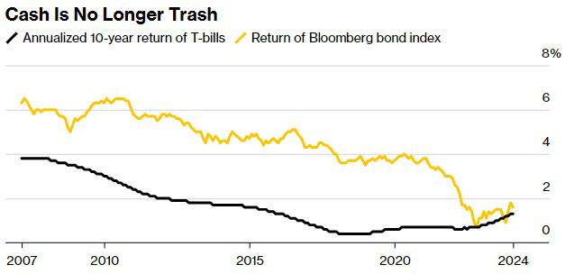 在截至2020年的10年间,彭博债券指数的年回报率为3.8%,而美国国库券的年回报率为0.7%。随着疫情的爆发,这种情况发生了变化,飙升的通胀促使美联储将目标利率上调至5.25%至5.5%的区间,这是2001年以来的最高水平。债券市场崩溃,现金再次成为可投资的资产类别。