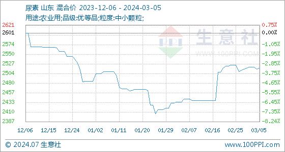 3月5日,生意社尿素基准价为2515.00元/吨,与本月初(2516.67元/吨)相比,下降了-0.07%。