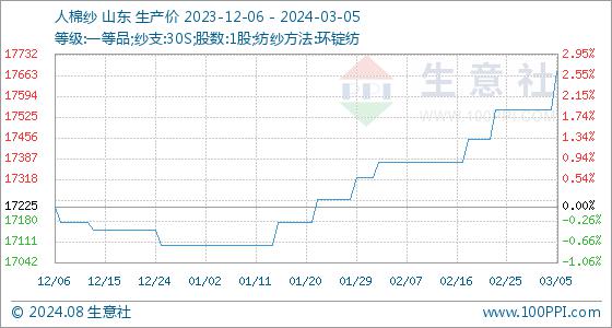 3月5日,生意社人棉纱基准价为17550.00元/吨,与本月初持平。