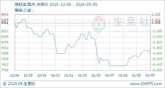 3月5日生意社菜籽油基准价为7965.00元/吨