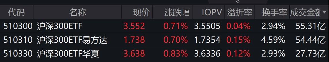 3只规模较大的沪深300ETF也集体出现放量,早盘合计成交137.48亿元。