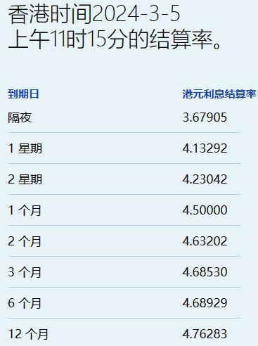 3月5日,港元拆息个别发展,短期拆息持续疲软。其中,隔夜息下降12基点,报3.67905%,逾一周以来新低。1星期拆息进一步跌至4.13292%,但与楼按相关的1个月拆息回升至4.5%,为2月23日以来最高。反映银行资金成本的3个月拆息升至4.6853%,创一周新高,与同期美元LIBOR息差维持91基点。长息方面,6个月及1年期拆息分别回落至4.68929%和4.76283%。