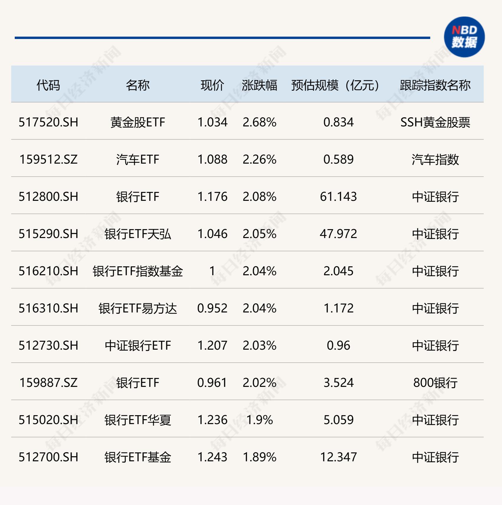 ETF涨跌幅方面,多只银行相关ETF大涨逾2%。