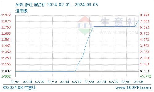 近期国内ABS市场行情比较稳定。截止3月5日,ABS产品均价在11787.50元/吨。ABS上游三料总体表现偏强,对ABS成本端支撑力度增强。石化厂开工继续下调,供应压力显著缓解。需求端由于下游企业复工滞后,周期内ABS消费一般,商家报盘拉涨后有让利走单出货操作。后市短期内需求放量预期不佳,预计ABS行情或将涨幅受阻。