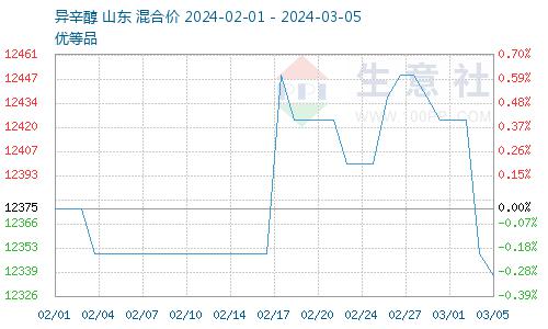 据生意社商品行情分析系统,截止2月29日,异辛醇报价12437.50元/吨,较2月16日报价12350元/吨上涨,涨幅0.71%;较2月1日价格12375元/吨上涨,涨幅0.51%;3月5日异辛醇价格12337.50元/吨,较2月29日价格下跌0.80%,较2月1日价格下跌0.30%。春节期间异辛醇开工低位,节后异辛醇开工缓慢恢复,异辛醇供给增多,异辛醇需求回暖不佳,2月异辛醇价格弱势盘整,节后原材料丙烯震荡上涨,成本支撑加大,3月异辛醇价格震荡盘整。