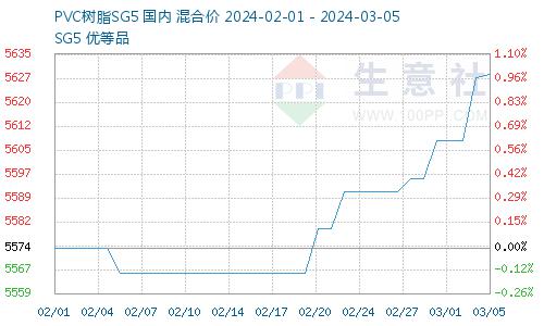 据生意社商品行情分析系统,截止3月5日,PVC报价5629元/吨,较2月29日PVC报价5596元/吨上涨,涨幅0.59%;较2月17日PVC价格5566元/吨上涨,涨幅1.13%;较2月1日PVC价格5574元/吨上涨,涨幅0.99%。节前PVC需求疲软,PVC价格震荡下跌,下游刚需采购,节后下游厂家陆续开工,节后PVC价格震荡上涨,增塑剂需求缓慢回暖。