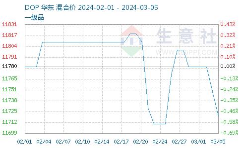据生意社商品行情分析系统,截止2月29日,DOP价格11780元/吨,较2月16日价格11810元/吨下跌,跌幅0.25%;较2月1日价格11780元/吨趋稳;3月5日DOP价格11720元/吨,较2月16日价格下跌0.76%,较2月1日价格下跌0.51%。原材料异辛醇价格、苯酐价格弱势盘整,增塑剂DOP成本支撑不足;节后增塑剂企业恢复开工,增塑剂DOP供给增多;下游需求恢复缓慢,增塑剂DOP价格弱势盘整。