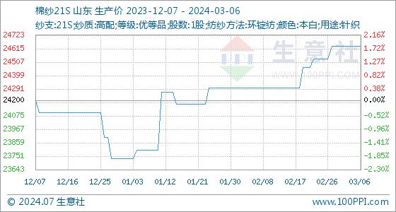 3月6日生意社棉纱21S基准价为24633.33元/吨