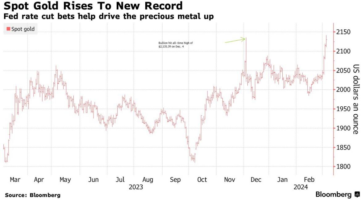 金价一度涨至每盎司2141.79美元,随后回吐涨幅,周二的高点超过了三个月前创下的2135.39美元的纪录。