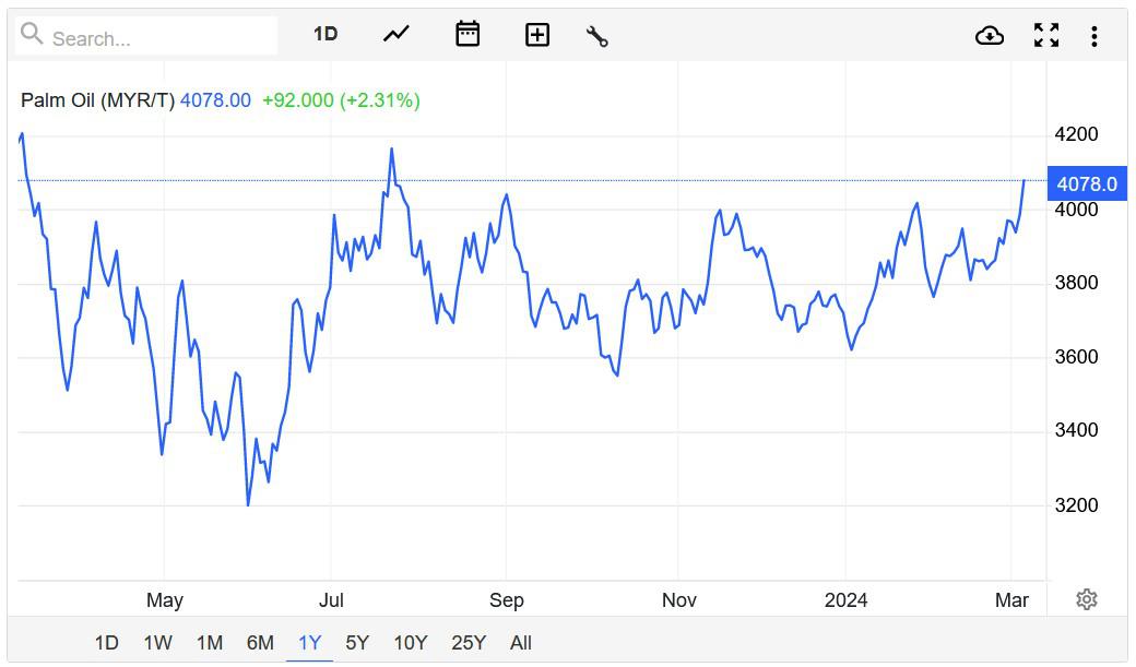 数据显示,当前的基准棕榈油期货价格为4078林吉特/吨,连续第二个交易日上涨,创7个月以来的最高水平;2024年迄今的涨幅接近10%。有分析师预计,由于种植园老化和缺乏扩张限制了产量,占全球产量最大部分的印尼和马来西亚棕榈油产量可能在2024年小幅上升,但也有可能较去年产量下滑。