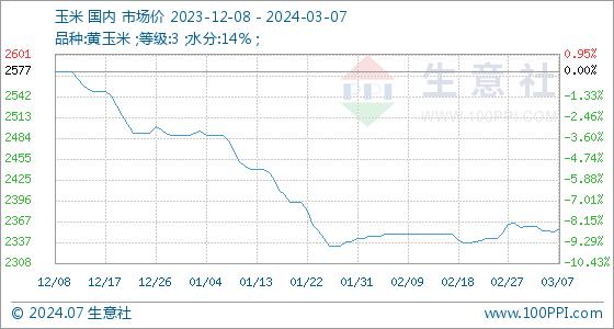 3月7日,生意社玉米基准价为2352.86元/吨,与本月初(2358.57元/吨)相比,下降了-0.24%。
