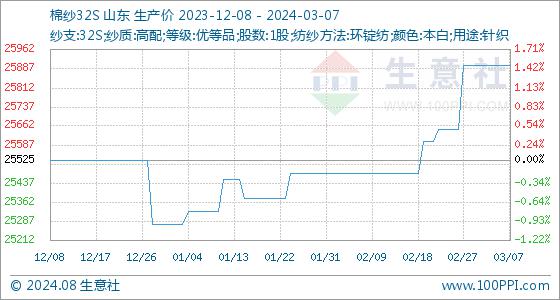 3月7日,生意社棉纱32S基准价为25900.00元/吨,与本月初持平。