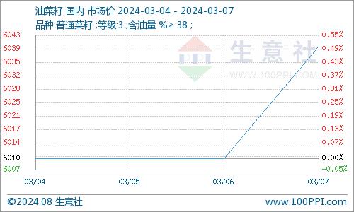据生意社商品行情分析系统监测,近期国产菜籽价格小幅上涨,3月4日国产菜籽市场均价为6010元/吨,3月7日国产菜籽市场均价为6040元/吨,上涨0.5%。春节后国产菜籽行情持稳为主,近期小幅上涨。春节前后受寒潮天气影响,对国产菜籽有减产预期,支撑行情小幅调整。加之节后菜油行情走势偏强,对国产菜籽有一定的支撑作用。目前菜油处于需求淡季,油厂对菜籽采购量有限,限制国产菜籽上行空间。短期内预计国产菜籽持稳为主,上调空间有限。