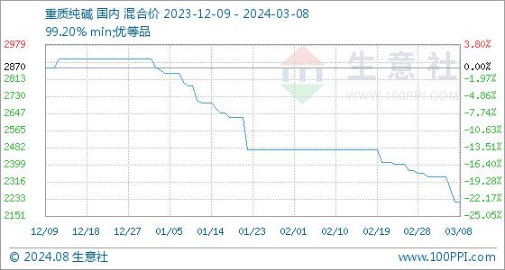 3月8日,生意社重质纯碱基准价为2220.00元/吨,与本月初(2360.00元/吨)相比,下降了-5.93%。