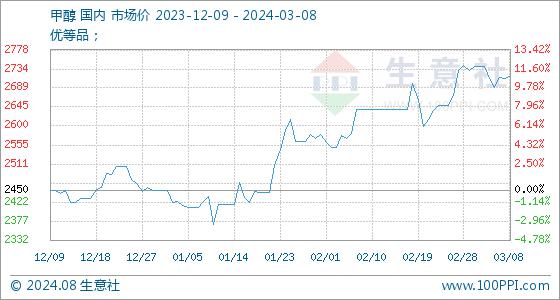 3月8日,生意社甲醇基准价为2711.67元/吨,与本月初(2730.00元/吨)相比,下降了-0.67%。