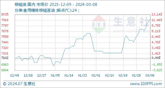 3月8日,生意社棕榈油基准价为7890.00元/吨,与本月初(7634.00元/吨)相比,上涨了3.35%。