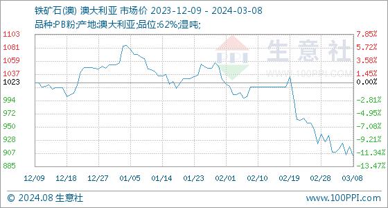 3月8日生意社铁矿石(澳)基准价为917.78元/吨