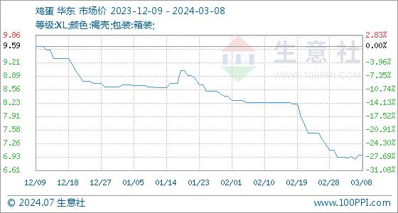3月8日,生意社鸡蛋基准价为6.98元/公斤,与本月初(7.10元/公斤)相比,下降了-1.69%。