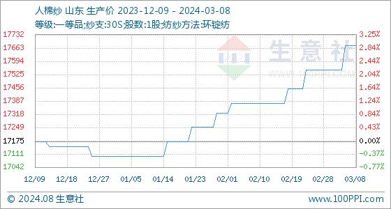 3月8日,生意社人棉纱基准价为17675.00元/吨,与本月初(17550.00元/吨)相比,上涨了0.71%。