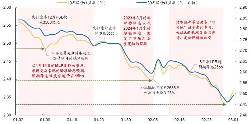 春节后,A股持续修复的同时,股债“跷跷板”效应并未显现,在大量买盘的推动下,债券演绎“超级牛市”!截至3月6日,10年期国债收益率下破2.3%,续创2002年以来新低,30年期国债更是罕见地成了全市场明星,债牛的这波能量似乎超乎所有人的想象。有人说,市场对国债利率阶段性底部的预判,甚至追不上10年和30年期破新低的速度,这番火热被市场中的每个投资者所感知。探寻本轮利率的顺畅下行,背后主要有三大驱动:一是中国经济过去的重心地产仍然处于一个并不短暂的冬天里;二是利率债发行进度偏慢,供给冲击减弱,银行间市场资金量相对充裕;三是超长端参与者日渐多元化,定价逻辑随风险偏好调整而改变。