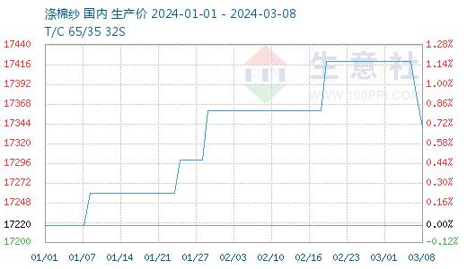 市场综述:据生意社商品行情分析系统显示,本周(3.2-3.8)纯涤纱及涤棉纱市场稳中偏弱,市场交投气氛一般,纺企反馈询价及成交情况不足,下游刚需采购为主,对后市信心下降。截止2024年3月8山东地区纯涤纱市场参考价格在12475元/吨,较上周下跌50元/吨,涨幅0.40%;涤棉纱市场参考价格微涨,报17340元/吨,较上周下跌80元/吨,涨幅0.46%。