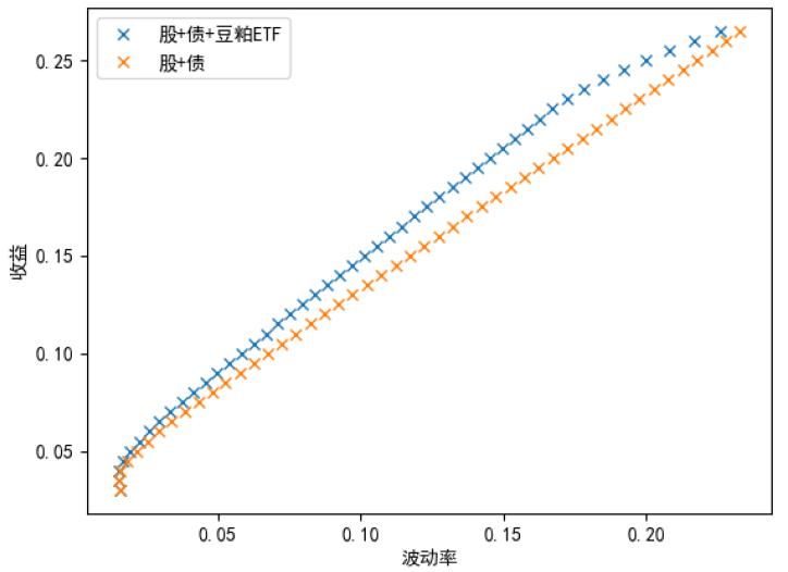 投资组合中加入豆粕ETF可以降低组合风险或者获得更高收益。通过实证得出,“基准组合+豆粕ETF”资产组合有效前沿曲线相比“基准投资组合(传统股票债券组合)”有比较明显的上移,即:在相同的风险水平下能获得更高的平均收益或在相同的收益水平下有更低的风险,商品ETF优化投资组合的效果明显。