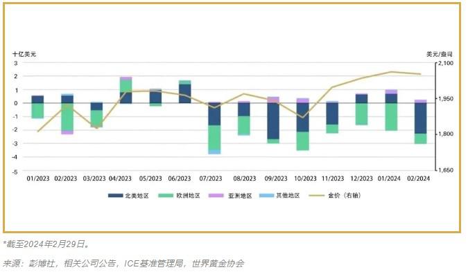 2024年前两个月,北美地区基金流出约合47亿美元,是有史以来第二差的开年表现,仅次于2013年(-50亿美元)。继2月流出后,北美地区黄金ETF总持仓跌至四年以来的最低点。