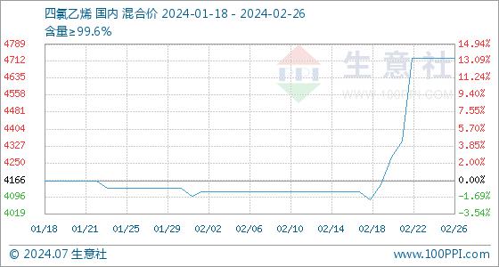 2月26日,生意社四氯乙烯基准价为4725.00元/吨,与本月初(4133.33元/吨)相比,上涨了14.31%。