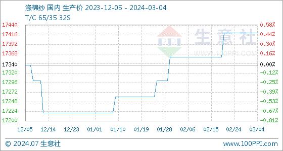 3月4日,生意社涤棉纱基准价为17420.00元/吨,与本月初持平。