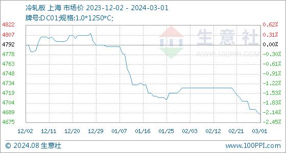 3月1日,生意社冷轧板基准价为4690.00元/吨,与上月初(4727.50元/吨)相比,下降了-0.79%。
