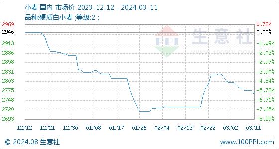 3月11日,生意社小麦基准价为2776.00元/吨,与本月初(2806.00元/吨)相比,下降了-1.07%。