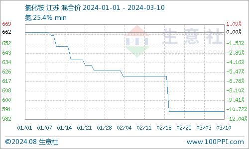 近日(3.1-3.10)氯化铵行情弱势整理,据生意社商品行情分析系统显示,截至3月10日农业用氯化铵干铵华东地区价格在590元/吨,较月初价格持平。原料液氨价格上涨,氯化铵成本面延续支撑;尿素价格窄幅整理,对氯化铵支撑偏弱;另外氯化铵开工高位供应面宽松,加之国内下游采购谨慎且出口受阻,氯化铵市场整体供增需弱,价格维持弱势整理态势。截至3月11日国内农业用氯化铵干铵主流出厂价在550~600元/吨。