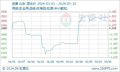 近日(3.1-3.10)尿素市场行情窄幅整理,对氯化铵影响较弱。据生意社商品行情分析系统显示,截至3月10日尿素价格在2520元/吨,较月初价格持平,周期内低点在2515元/吨。