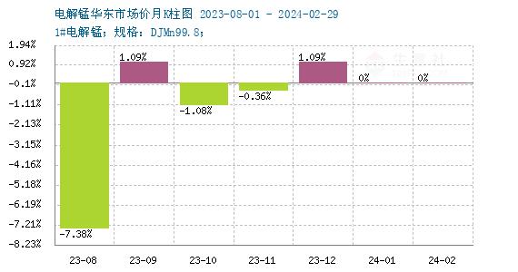 商品价格K柱图,运用价格走势K线的理念,以柱状图形式,反映每周或者每月的价格涨跌变化,投资者可以根据K柱图的变化,来进行买卖投资。红色表示:上涨;绿色表示:下跌;K柱高度表示:涨跌幅度。从以上周度和月度电解锰K柱图可以看出,近期电解锰市场走势偏稳。