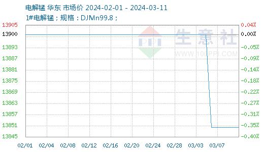 据生意社商品行情分析系统:本周(3月4日至3月11日)1#电解锰市场偏弱运行,华东地区市场价格3月11日价格在13850元/吨,跌0.36%。