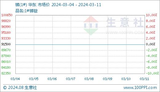 2024年3月4日至3月11日华东地区锑锭市场暂稳运行,本周价格在91500元/吨,暂稳。