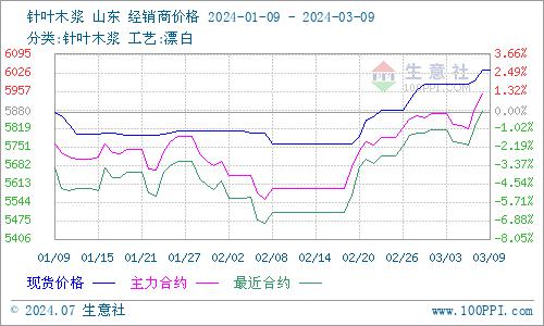 据生意社商品行情分析系统监测:近期针叶木浆和阔叶木浆价格不断走高。2024年3月9日针叶木浆山东地区市场均价为6038元/吨,与3月1日均价5984元/吨相比上涨了0.9%。3月9日阔叶木浆山东地区市场均价为5390元/吨,与3月1日均价5290元/吨相比上涨了1.89%。