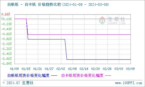 白卡纸和灰底白板纸价格暂稳运行,3月9日白卡纸230g-400g市场均价为5206.67元/吨,灰底白板纸250g市场均价为3999元/吨。节后白卡纸规模纸厂价格拉涨态度较明显,3月初又发布4月提涨通知。受纸厂价格提涨影响,贸易商成本压力增加,低价惜售心理提升。白板纸方面,自2月底至3月初,规模纸厂陆续执行价格优惠政策,使得周边部分纸厂陆续跟跌,在下游客户新单有限,市场需求整体跟进不足的状态下,价格暂稳观望。从当前终端需求来看,由于两者具有相似的消费属性,应用领域存在较高的重合度,因此受需求变化的影响较为一致。
