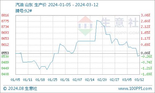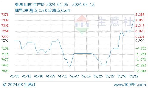 据生意社商品行情分析系统,3月以来国内地炼汽柴油价格行情走势分化,截止12日国内92#汽油价格为854.2元/吨,价格下滑0.84%;国内0#柴油价格为7345.8元/吨,价格上涨2.65%。