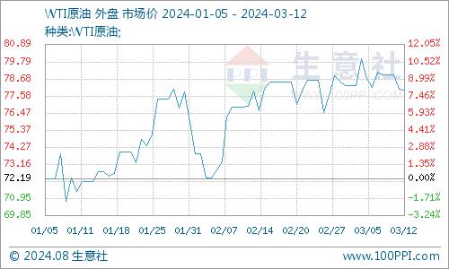 近期国际油价区间震荡为主,截止11日美国WTI原油期货主力合约结算价报77.93美元/桶,布伦特原油期货主力合约结算价报82.21美元/桶。进入3月份原油市场区间震荡为主,一方面中东地缘局势紧张因素仍是原油市场的主要提振因素;加之产油国按照预期减产也是支撑油价的一大重要因素。另一方面美联储释放鹰派信号,降息推迟预期打压市场信心;美国原油库存连续第六周上升,升幅140万桶,达到4.485亿桶,分析师预期为增加210万桶,原油价格受到压制。原油市场震荡为主,成本面对于国内成品油市场仍有支撑。