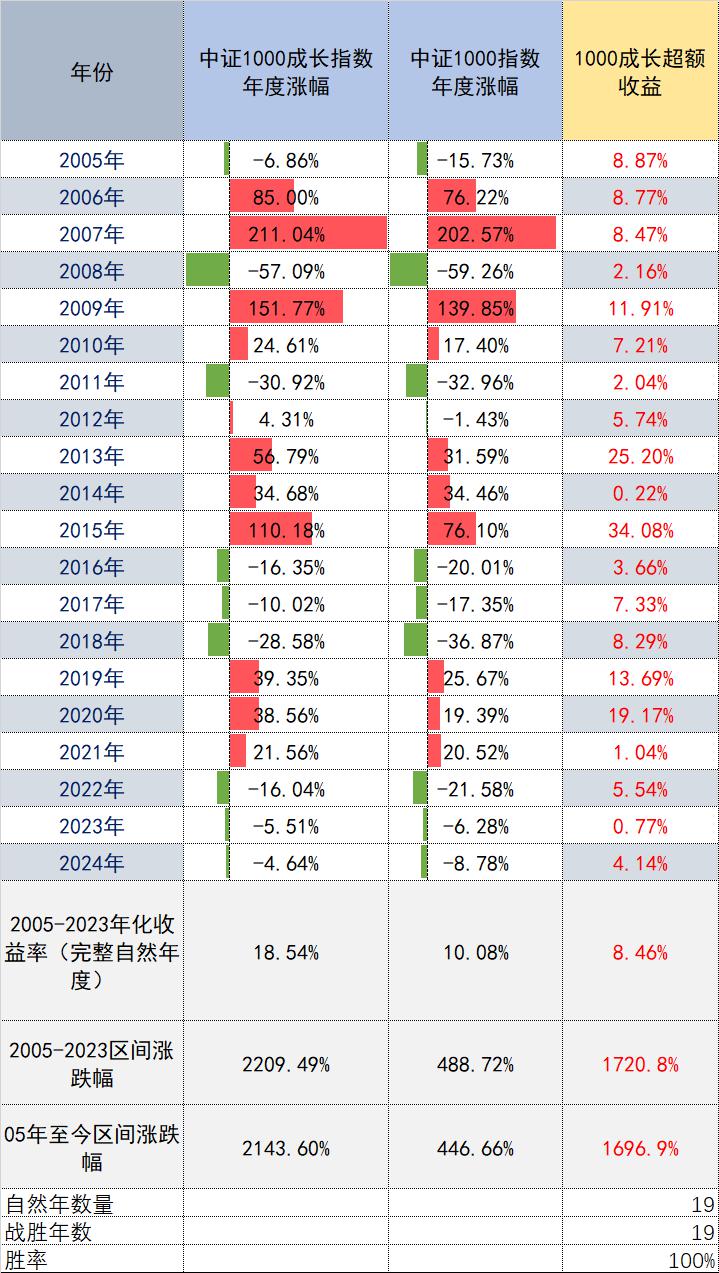 1000成长创新指数是中证1000指数的策略指数,在1000只股票中选出150只研发投入占比高、财务质量好、预期净利润上调的股票构建组合,小盘特征显著。2005年至今连续19个自然年度跑赢中证1000指数,胜率达100%。2005年-2023年区间累计涨幅2209.49%,超额1720.8%,年化收益率达18.54%,平均每年比中证1000指数多赚8.46%。