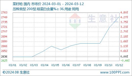 据生意社商品行情分析系统监测,3月开始菜粕结束前期下跌态势,保持上涨趋势。3月1日菜粕市场均价为2636元/吨,3月12日菜粕市场均价为2751元/吨,期间上涨幅度在4.36%。