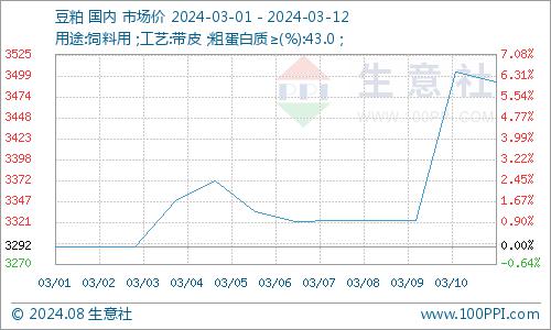 豆粕方面:据生意社商品行情分析系统监测,3月1日豆粕市场均价为3292元/吨,3月12日豆粕市场均价为3504元/吨,期间上涨幅度在6.44%。近期豆粕行情上涨,拉动菜粕行情上涨。受巴西大豆升贴水上涨及美豆反弹,大豆进口成本上升,加之3月USDA报告中性偏多,期货行情上涨,大豆油厂抬价,贸易商逢涨买进,豆粕行情大涨,带动菜粕行情上涨。