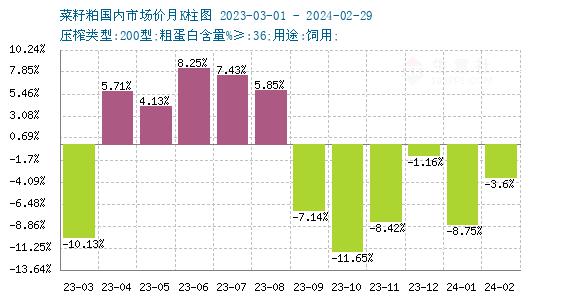 据生意社月K柱图显示,从2023年9月开始国内菜粕开启连续下滑趋势,截止2024年2月已连续下跌6个月,其中最大跌幅在10月份为11.65%,其次是24年1月跌幅8.75%。3月菜粕价格出现反弹。