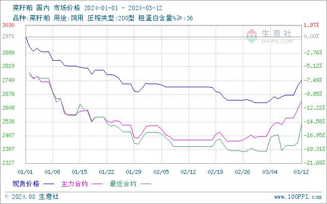 3月12日,菜粕期货主力2405合约涨1.96%,开盘2602元,收盘2654元,涨51元,最高2675元,最低2594元,昨结2603元,结算2643元。进入3月菜粕期货偏强走势,在一定程度上提振现货行情。