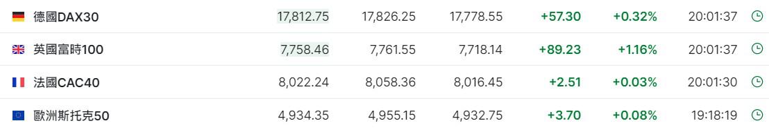 2. 截至发稿,德国DAX指数涨0.32%,英国富时100指数涨1.16%,法国CAC40指数涨0.03%,欧洲斯托克50指数涨0.08%。