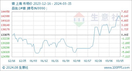 3月15日,生意社镍基准价为142416.67元/吨,与本月初(137850.00元/吨)相比,上涨了3.31%。