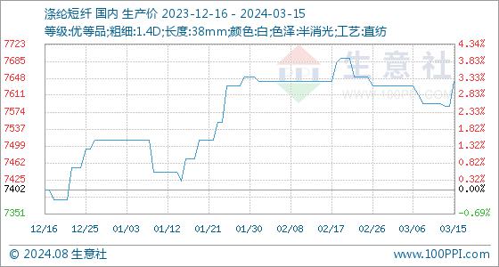 3月15日,生意社涤纶短纤基准价为7586.00元/吨,与本月初(7632.00元/吨)相比,下降了-0.60%。