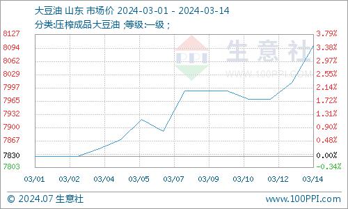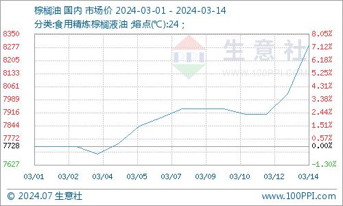 据生意社商品行情分析系统显示:3月以来,豆油棕榈油行情迎来好转,价格振荡上行为主,棕榈油涨幅较大,超7%,豆油涨幅超3%。3月1日,豆油市场均价7830元/吨,3月14日,豆油市场均价8100元/吨,价格上涨3.45%。3月1日,棕榈油市场均价7728元/吨,3月14日,棕榈油市场均价8290元/吨,价格上涨7.27%。